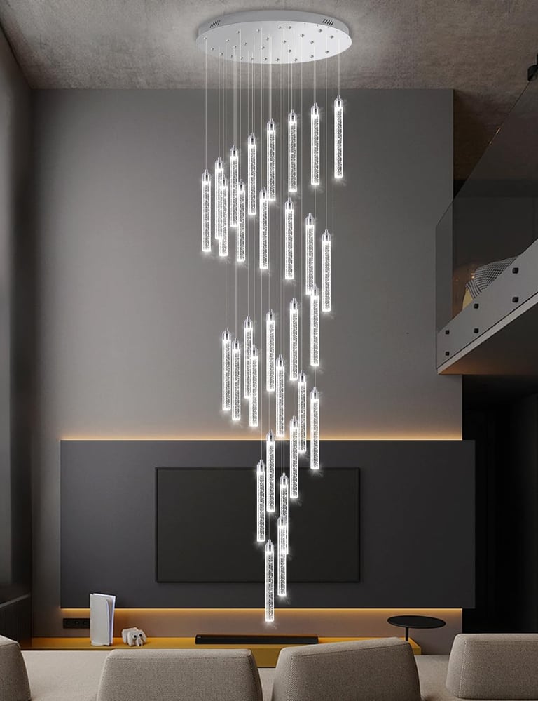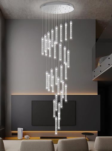 Transform your home with the stunning 30-Light 197" High Ceiling Modern Crystal Chandelier—a true statement of beauty and elegance. Designed to impress, this chandelier adds a luxurious touch to any room, from your living room to your staircase.