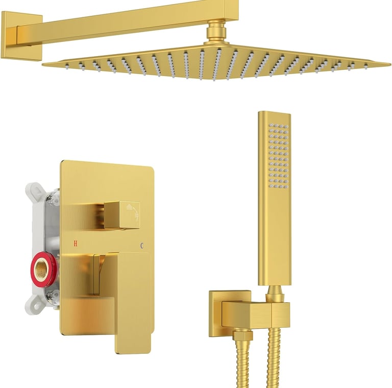 Iriber Brushed Gold Rain Shower System with 12 Inch Shower Head and Handheld shower Bathroom Wall Mounted Golden Shower Set Contain Shower Faucet Mixer Valve and Trim Kit (Valve Cartridge Included)