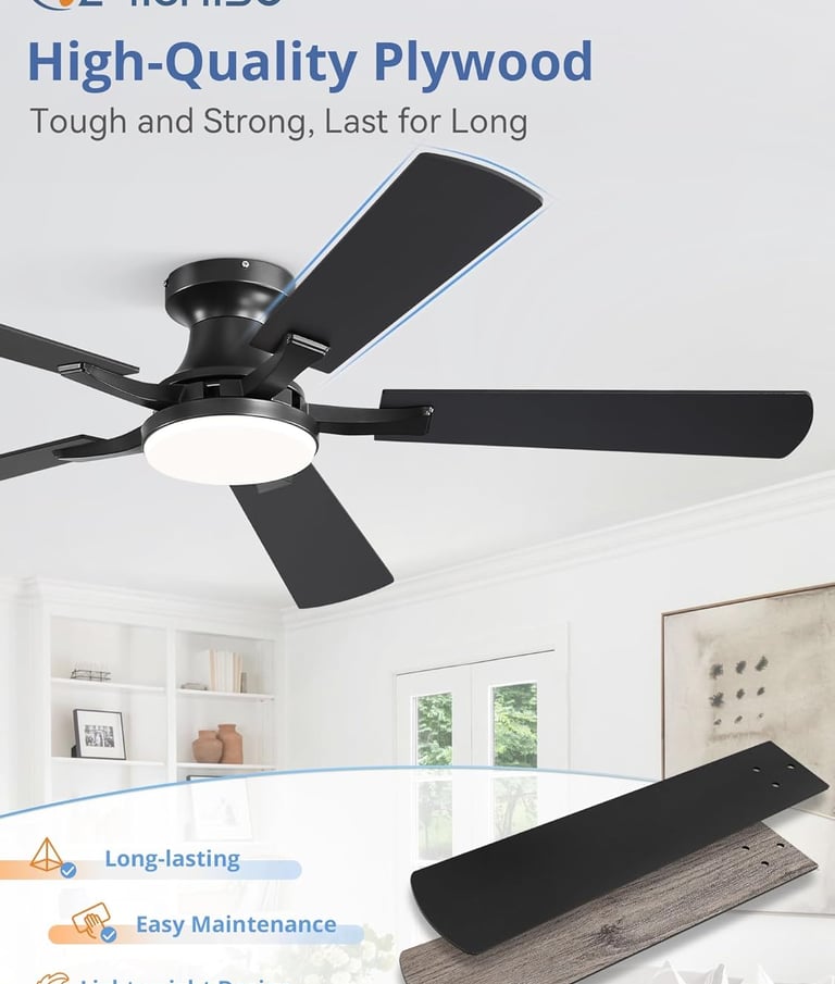 ZMISHIBO 52 Inch Ceiling Fan with Light, App&Remote Control, Flush Mount Low Profile, Dimmable 20W LED Light, Quiet Reversible Motor for Bedroom, Living Room, Apartment, Black