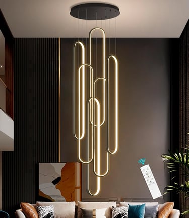 Modern Rings Chandelier. This chandelier features six 40'' ring that gracefully drop down from the ceiling plate. The minimalist lines of the design, the huge chandelier illuminate a large area without taking up too much space, suits your classic and elegant home
