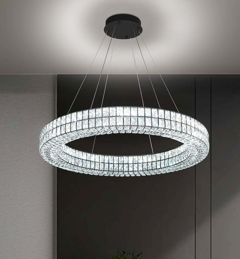 Crystal Pendant Light Size :Ring Chandelier Size Diameter: 40''; Flush mount canopy: dia 8''. Maximum Hanging: Height Adjustable from 20'' to 120''. The cable length and crystal ring shape can be adjusted. Sturdy in construction and durable for daily use. Ideal for sloped/low/Middle layer. Perfect for Living Room, Bedroom, Dining Room, Kitchen, Bathroom, Foyer, Hallway, Office, etc.Please ensure dimensions of this crystal chandeliers is fit for your prepared space or not.